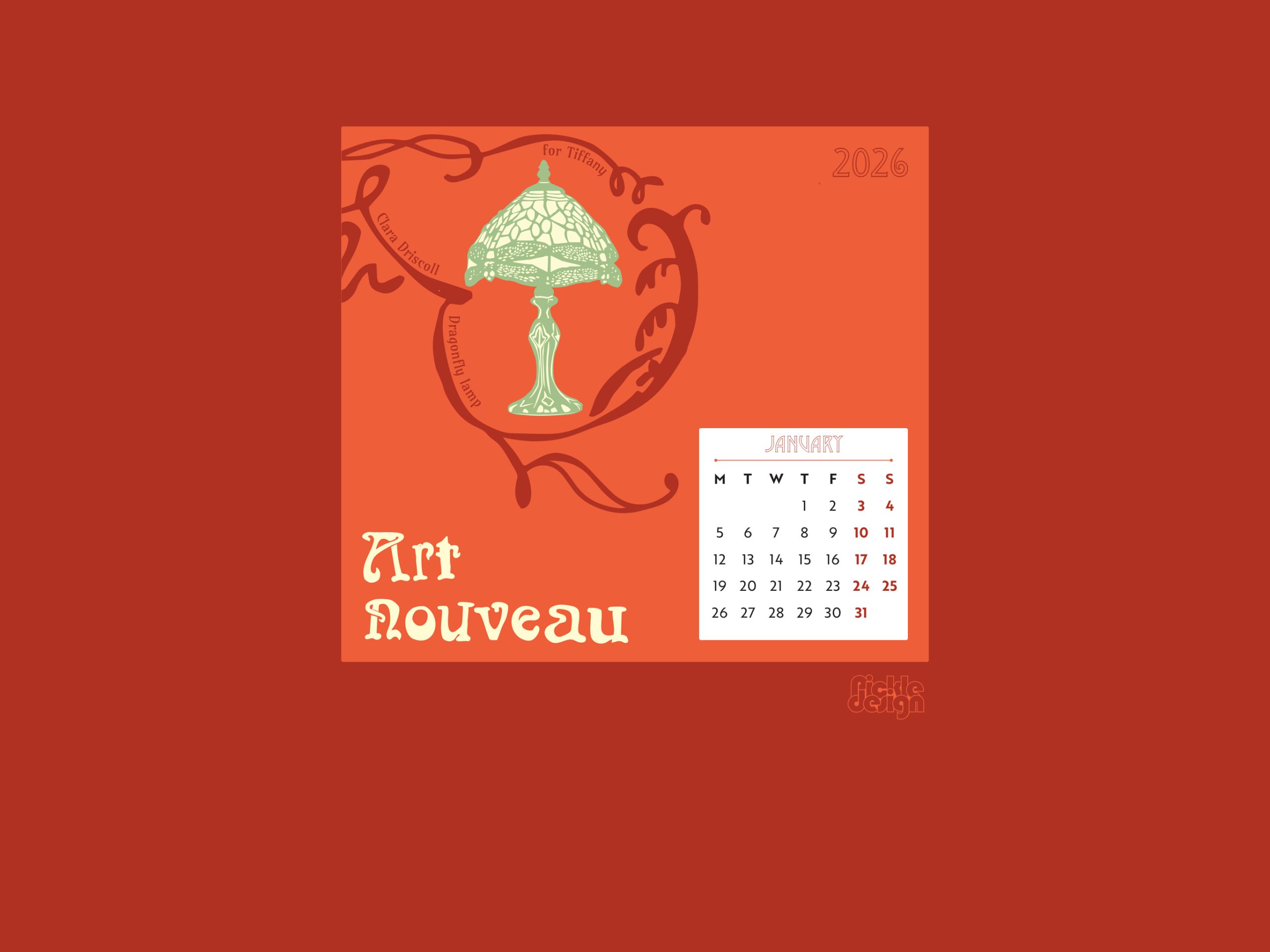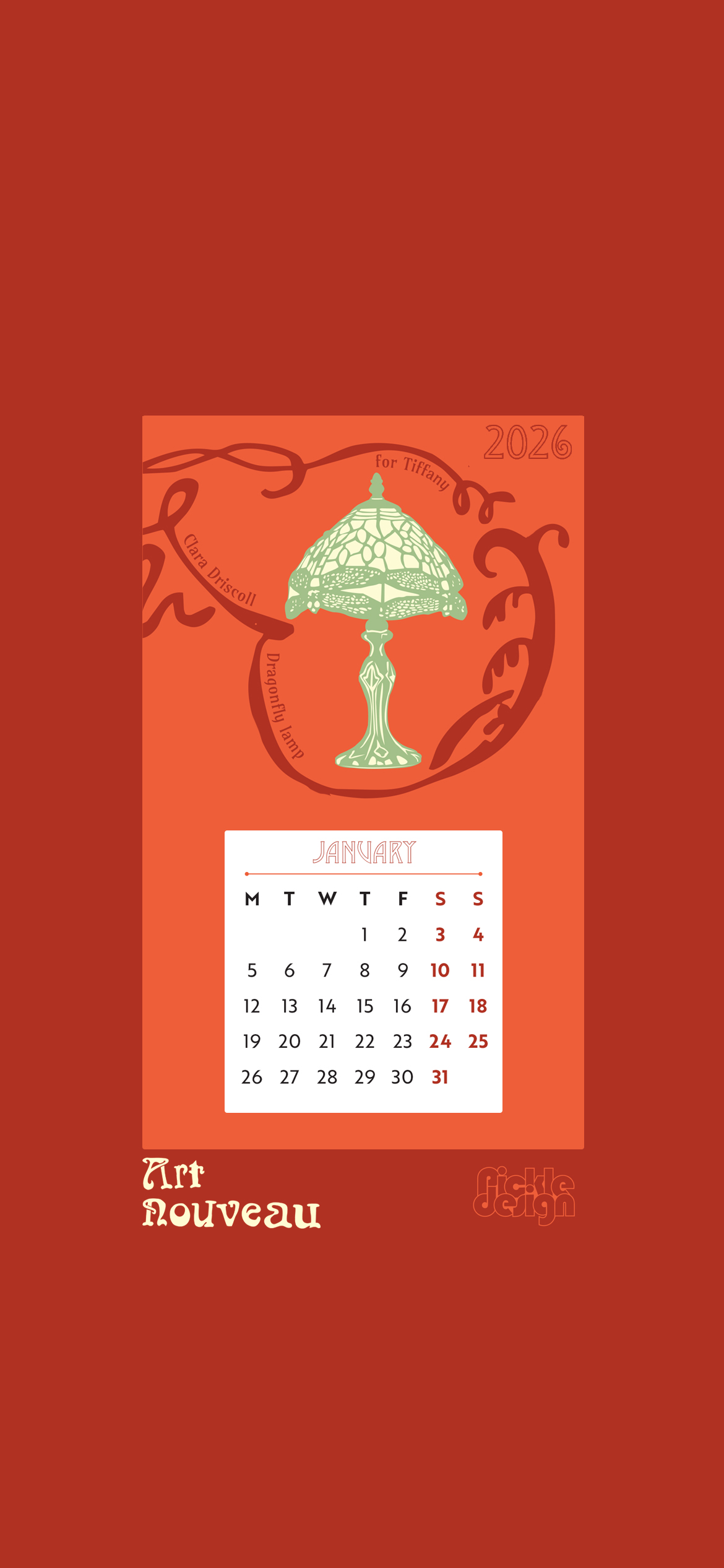 We are so excited to bring you our latest poster calendar! This year we turned our attention to Art Nouveau, capturing key elements of this movement in vibrant style. For January we chose the Dragonfly Lamp by Clara Driscoll for Tiffany.